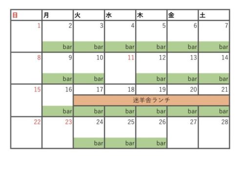 ルーサイト カフェ&カフェバー 2026年2月営業日程